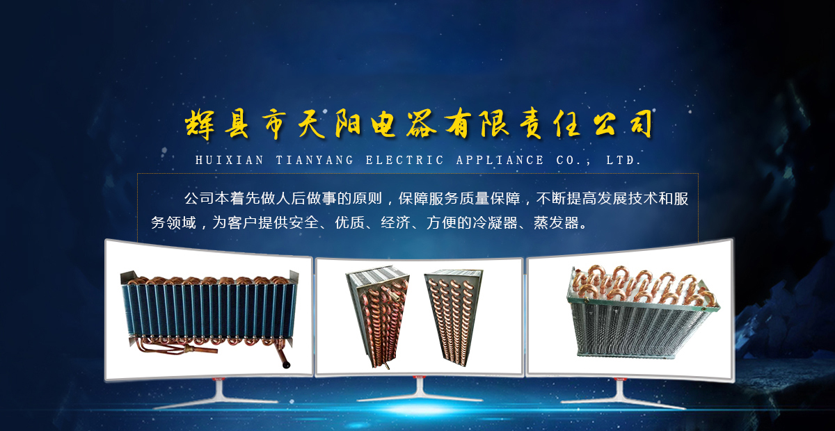 輝縣天陽(yáng)電器有限責(zé)任公司位于肥沃的中原河南省輝縣市學(xué)院路中段工業(yè)集聚區(qū)興業(yè)園3號(hào)廠房,以制冷設(shè)備用冷凝器,蒸發(fā)器,熱交換器為主。主要材料為銅管鋁翅片,銅管銅翅片,鋁管鋁翅片。廣泛應(yīng)用于冰箱冰柜,制冷設(shè)備,暖通設(shè)備,空調(diào),自動(dòng)售貨機(jī),冷干機(jī),超市立風(fēng)柜,冷藏車,烘干機(jī)等產(chǎn)品領(lǐng)域。  公司自1998年成立以來(lái),始終堅(jiān)持:“科技造就產(chǎn)業(yè)、質(zhì)量成就信譽(yù)、誠(chéng)信鑄就輝煌”的質(zhì)量方針,從產(chǎn)品拓展上堅(jiān)持“人無(wú)我有,人有我優(yōu),人優(yōu)我特的”經(jīng)營(yíng)理念,25年來(lái),從1998年開(kāi)始供應(yīng)河南冰熊集團(tuán)下屬的冷柜廠,制冰機(jī)廠各種冷凝器;2003年之后,原冰熊集團(tuán)的精英志士開(kāi)始在全國(guó)各地發(fā)展,所到之處依托我公司供貨,以致于多家目前已具行業(yè)中佼佼者的公司,從而建立了如凱雪公司,兆邦公司、凌云公司、海寶公司、正雪公司、上海忠云、山東德萊維等幾十余家公司在草創(chuàng)時(shí)期的啟蒙供貨商,友好共贏長(zhǎng)達(dá)十余年,成為我國(guó)制冷行業(yè)的供應(yīng)商。以致在2015年初雙匯集團(tuán)面向社會(huì)的招標(biāo)書(shū)中指名要我公司冷凝器、蒸發(fā)器指定產(chǎn)品供應(yīng)商